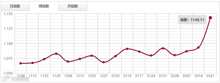 本周原木分类指数涨势拉升,周指数报收1143.11点,周环比上涨50.13点,涨幅4.59%。全周销量环比下滑0.95%,交易额增加4.39%。其中广东鱼珠、上海福人周指数表现强势,分别上涨了24.52%、6.47%,而四川大西南周指数也有2.05%的上涨。