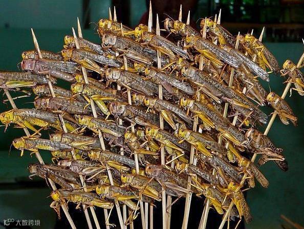成串的蝗虫,据当地人说蝗虫烤、炸、煎怎么弄都好吃,老人小孩都喜爱