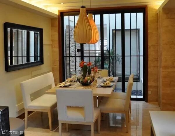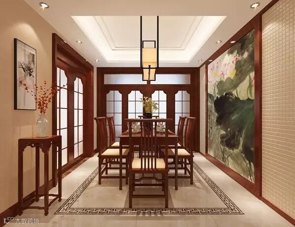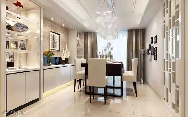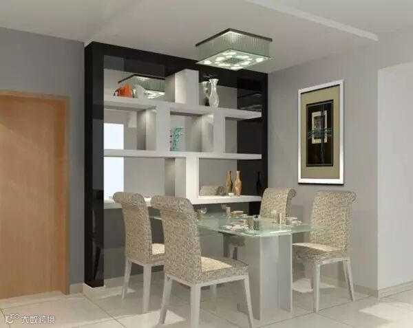 就餐区与会客区可以用如用壁式家具做闭合式分隔,也可以用屏风、花槅做半开放式的分隔。但需要注意不妨碍通行,并且与会客区在风格上保持协调统一。