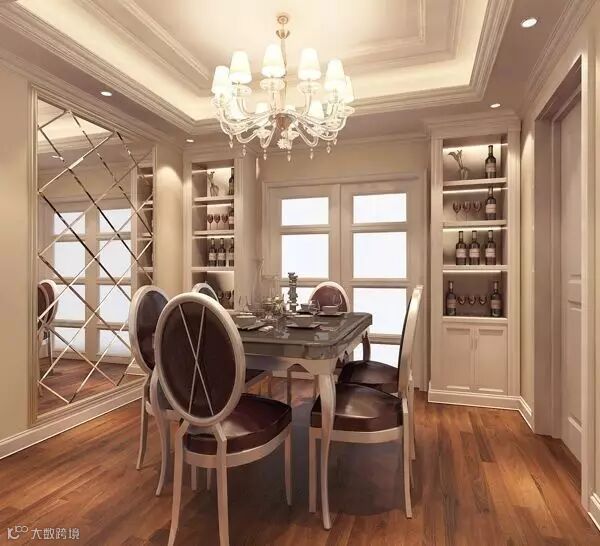 齐腰位置考虑用些耐磨的材料,如选择一些木饰、玻璃、镜子做局部护墙处理,而且能营造出一种清新、优雅的氛围,以增加就餐者的食欲,给人以宽敞感。