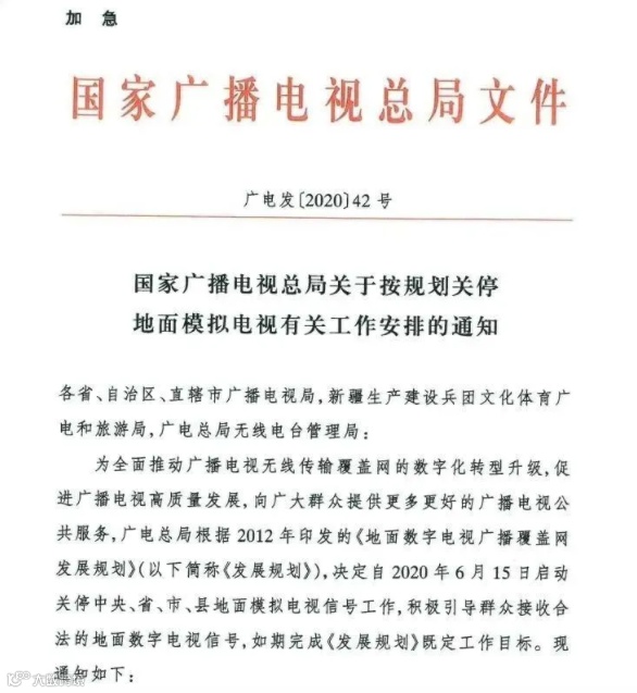 中央节目、地方节目地面模拟电视信号的关停:自2020年6月15日起,各地启动中央节目地面模拟电视信号关停工作,于2020年12月31日前完成关停。