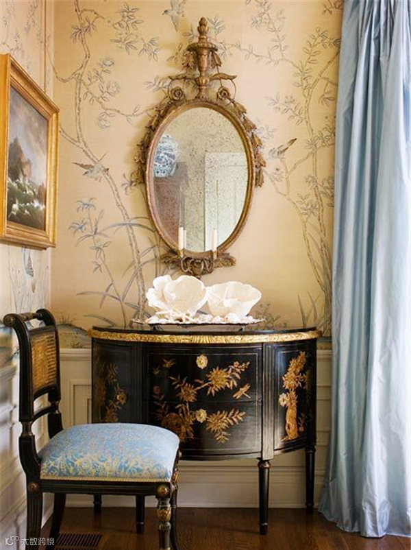 在大面积的镜子中,挂了一面园形的镜子,乍一看就像一滴水在水面上激起的涟漪,仿佛能听到水的流动。拥有了明黄色灯罩的两盏台灯现代感十足,明黄色又是中式文化的主流色彩,虽是中西合璧,但风格特征并不明显,反而达到了高度的统一。
