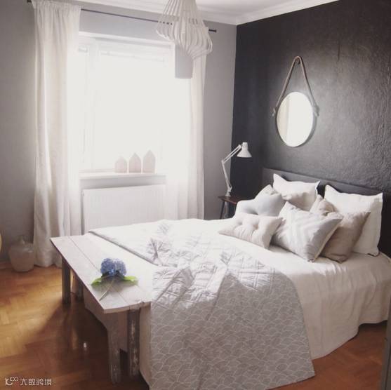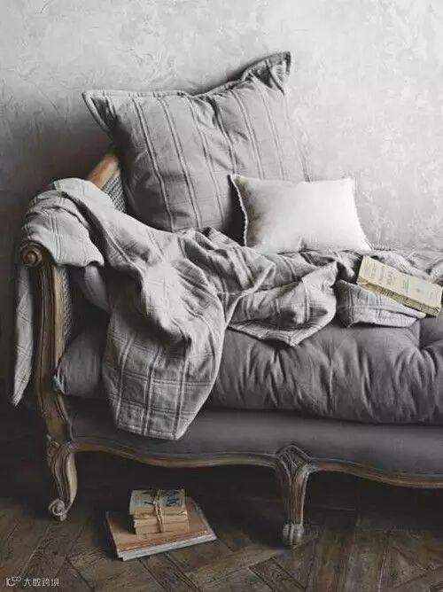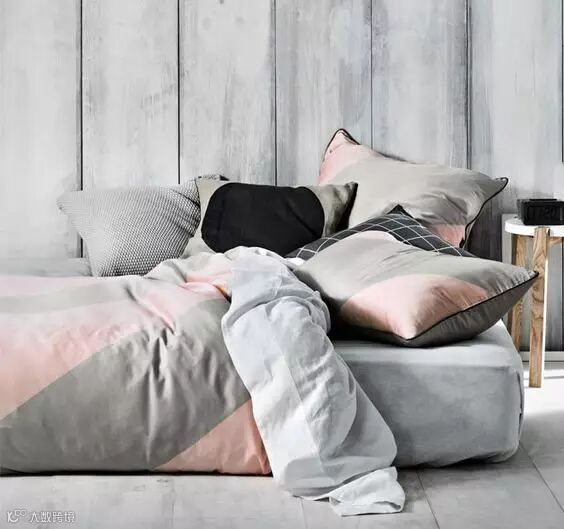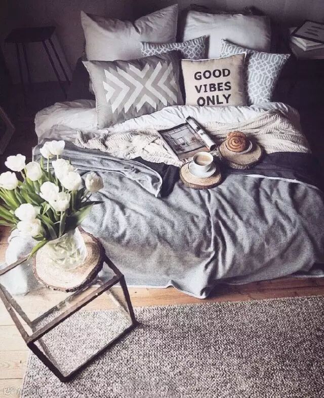 ▲地毯与床单、枕头不同层次的灰色搭配在一起,充满英伦的质感