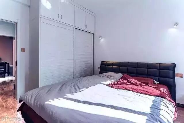 白色的衣柜,黑色的皮质床,两个射灯点亮床头,简洁而不单调。