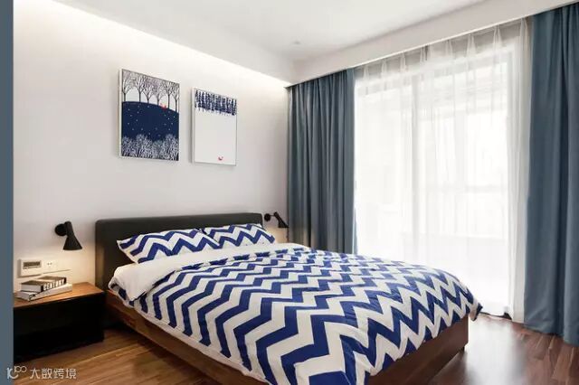 ▲ 卧室采用的是蓝白色调,非常适合睡眠的宁静空间。蓝色的床品、挂画、窗帘,搭配起来太美了!