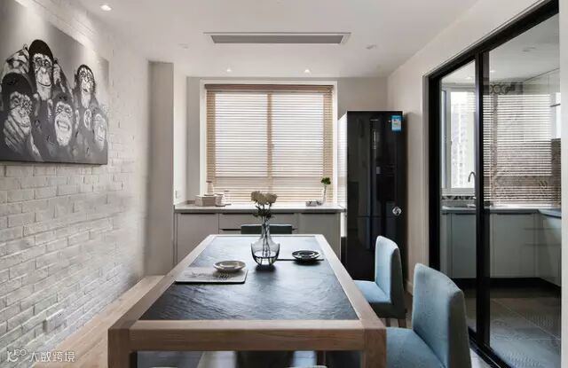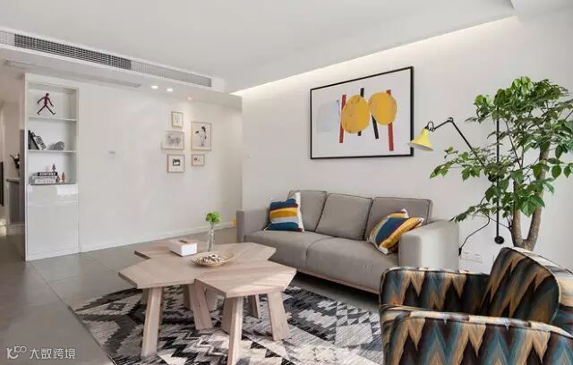 ▲ 没有吊顶,也没有专门的背景墙,简单的一大幅挂画,就很美。高高的落地绿植也是宜家风格家居必备。