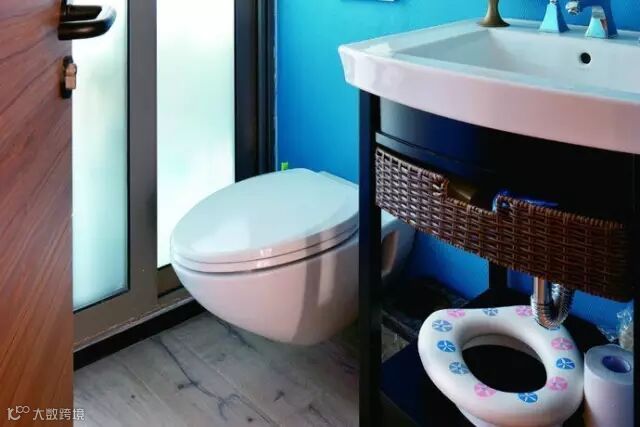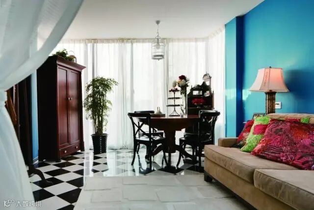 这套墙面大胆的采用了蓝色,使得整体空间看起来非常的亮眼,地板采用了黑白的地面砖,宛如一盘旗子,非常的有味道。