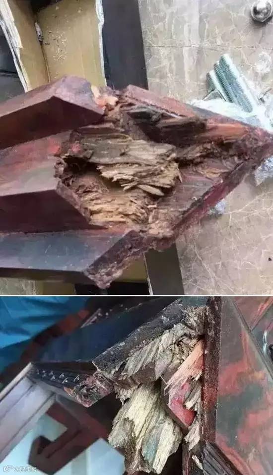 因为一些家具边框的重叠交错,在“巧妙”的布置与做工之后,成品之后从外表一般看不出破绽,在破坏之后它的“黑心”方显露无疑!