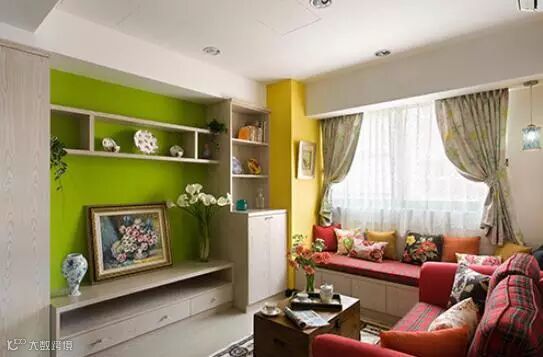 客厅窗边规划卧榻式收纳,满足收纳机能外,也补足双人沙发不足的坐卧空间。