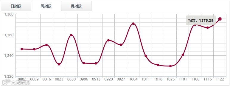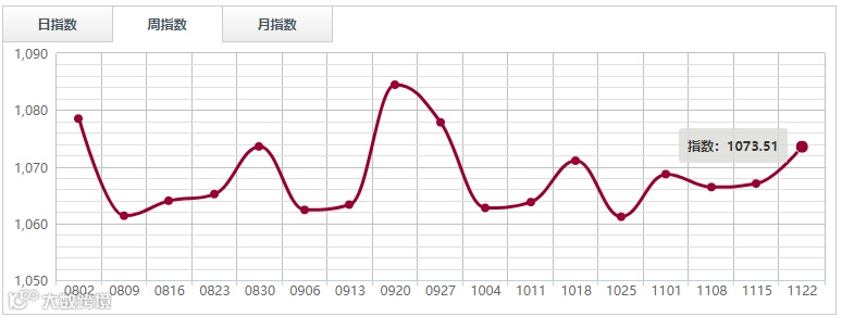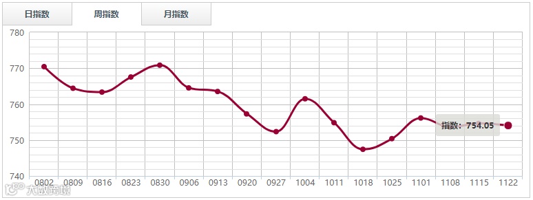 中国木材价格指数(CTI)综合指数本周报收1185.89点,环比下跌0.12%。其中广东鱼珠木材价格指数(YTI)报收1097.03点,上涨0.75%;上海福人木材价格指数(FTI)报收1242.18点,跌1.41%;大西南木材价格指数(DTI)报收1012.98点,涨1.82%;山东临沂木材价格指数(LTI)收于810.89点,跌1.04%;江西南康木材价格指数(JTI)收于1616.52点,微涨0.01%。