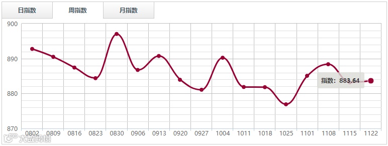 经过上周的回落调整之后,本周人造板分类指数以横盘整理化解之前的下跌态势,报收883.64点,环比微涨0.05%。各大市场当中,鱼珠人造板指数、大西南人造板指数分别上涨0.34%、2.94%;福人人造板指数、临沂人造板指数分别下跌0.76%、1.04%。