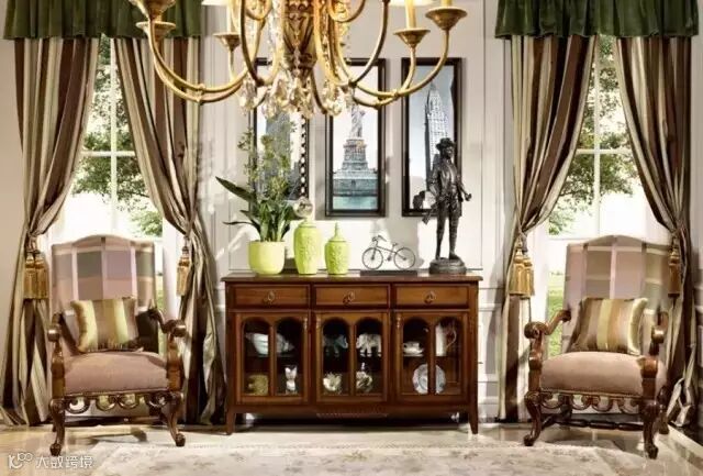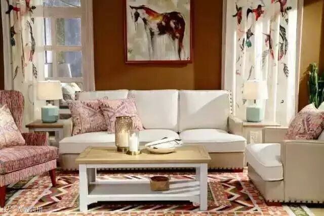 美式早期家具在材质及色调上表现出粗犷、不经加工的质感,而自由组合成各种所需也是美式家具的重点;受到墨西哥传统手工影响,原住民图腾夹杂各式草编物,厚重的原木色,都让美式家具很受国人喜爱,而编织布的使用更让美式空间更显特色。其编织布以原质地者为多,在色系上活泼鲜明抑或温暖高雅,都可以是美国风的表现。