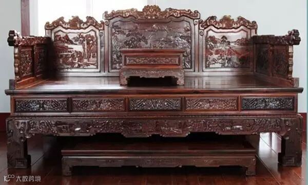 中国式家具中向来以雕刻著称、雕刻中尤以审文、回文、满卷为意、梯形、凤爪、猫足、几何形体为多;材料以珍贵木材为主,装饰以雕漆、镶嵌、贴附为多;直接彩绘、起线、倒楞最为普遍。