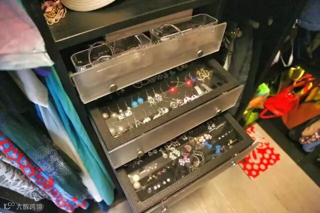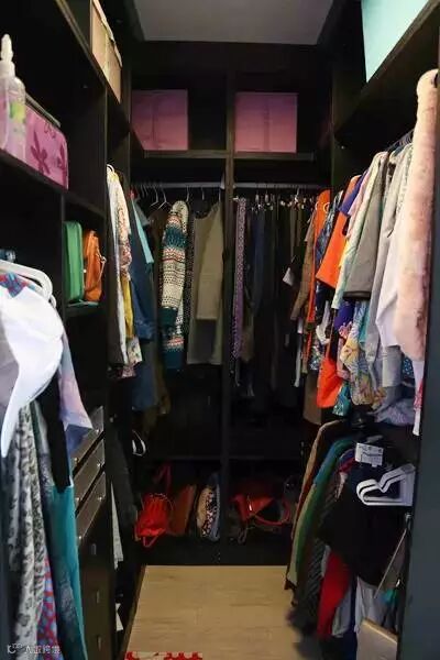 在卧室隔出一个衣帽间,U型格局,挂各种长短衣服,上面用收纳箱,放不常用的东西,下面放包包。