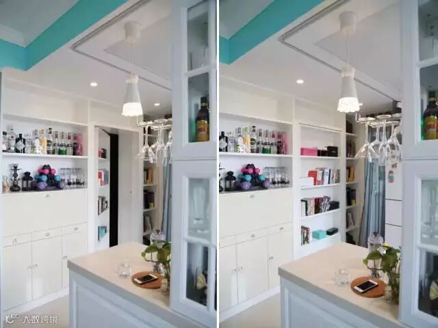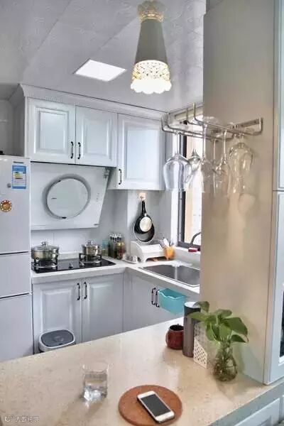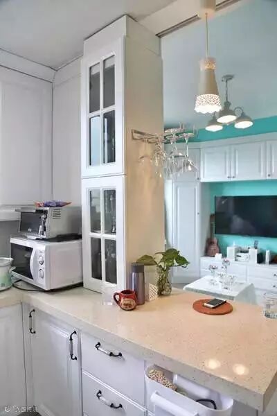 开放式厨房结合酒柜和酒杯支架,边做饭边看片子,其乐无穷。