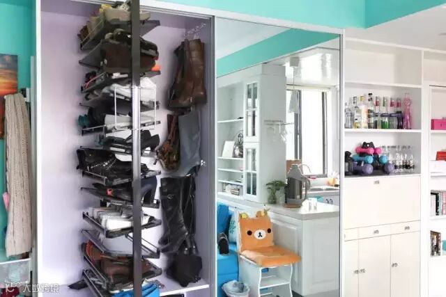 客厅大型储物鞋柜,关起来就是镜柜,可以在客厅做各种有氧健身操。