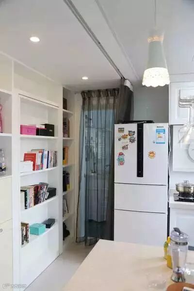 为避免油烟,特意在吊顶处留了轨道,加装了的薄纱帘,略微的隔断,分隔厨房油烟。