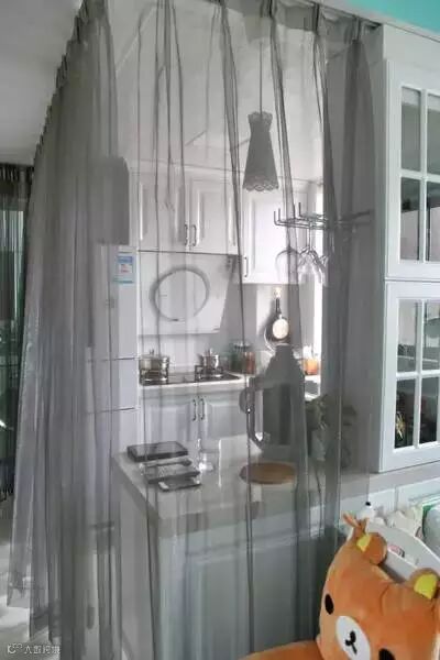 卫生间。风水上开门见卫生间门不好,因此特地加了薄纱帘,与厨房的纱帘是同款。