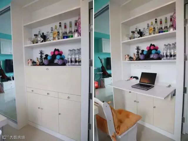 过道书柜。打开抽屉,翻下小桌板,这里就是一个小书桌。闲暇时,胡小姐也会在这儿打打网游。