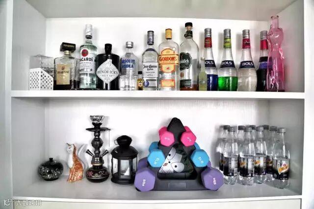 调酒也是胡小姐的兴趣爱好之一,过道的这个展示柜摆满了瓶瓶罐罐,偶尔也会小酌一杯。