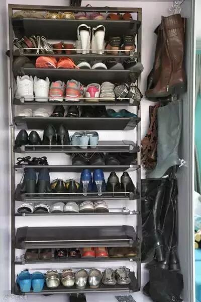 鞋柜里的支架是网购来的,可以旋转,共12层,每层可放4-5双,2个大约可放100双鞋,侧面安装了挂钩,可以放长靴。不得不说,这个鞋柜的收纳功能太强大了。