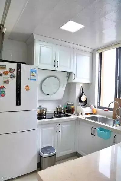 L型橱柜格局合理,一边放置了冰箱,另一边是与客厅隔断的吧台。从厨房的窗户能看到东方明珠,风景不错。