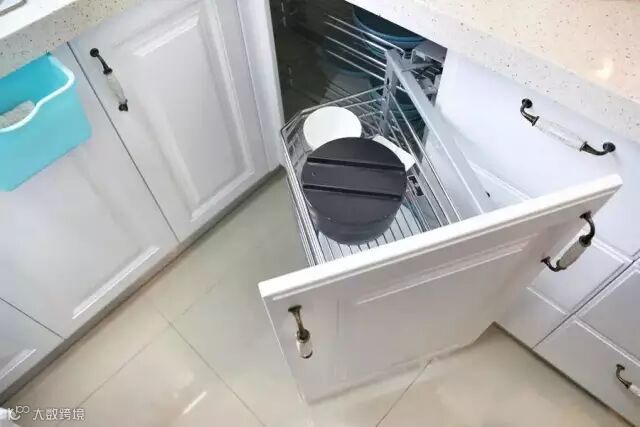 橱柜转角收纳。两个把手拉起来更稳,也不会影响美观。