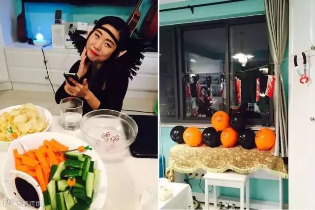 胡小姐的爱好广泛,会弹吉他、钢琴,下围棋、煮饭、看书、旅行、打台球等等。这是2015年万圣节时和闺蜜在家轰趴时的照片。