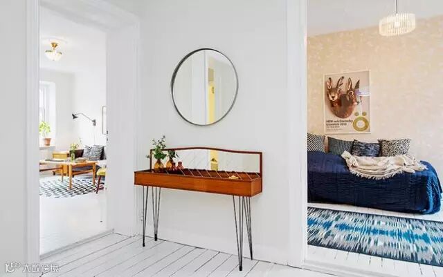 ▶室内空间显得整洁而大方。客厅当中的两个拼花沙发以及餐区上方的夸张吊灯,都给客厅带来一种近似波西米亚的独特感受。厨房利用黄色,书房的壁纸,卧室的蓝色,卫浴间的人脸壁纸,不仅给各个空间不同的感受。同时,又使空间易于辨别,使得各个空间也有了个性。
