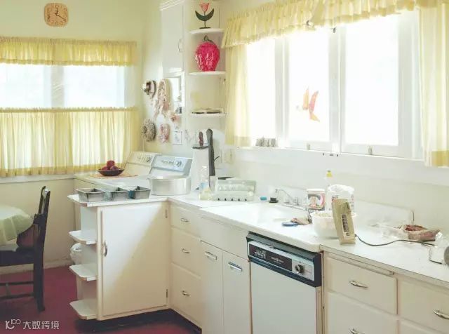 这样柜子一角的花,通透的厨房,阳光够充足。在这样的厨房里为心爱的人洗手做羹汤也是一种幸福吧。