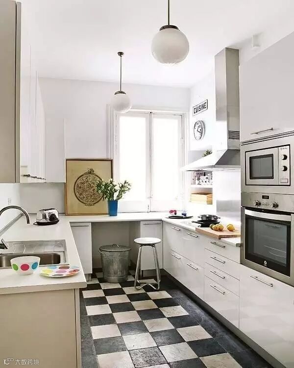爱上干净整洁的厨房。不用普通的日光灯,这种圆形的吊灯很点造型感。纯白与周围的环境又很吻合。喜欢。