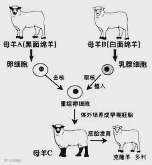 受体去核卵母细胞来自一只黑面绵羊,通过同样的方式将两者融合并植入到第三只雌性绵羊的子宫,最后就诞生了多莉。