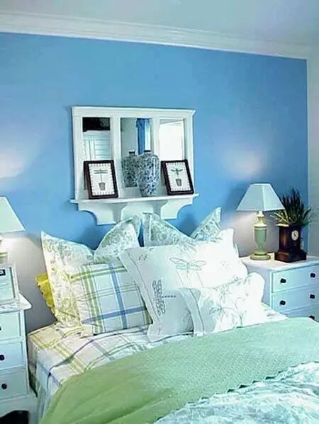 挂上湖面蓝的横条纹挂画,不仅从颜色上营造一个简约清爽的卧室,而且整个空间看起来变得宽阔。