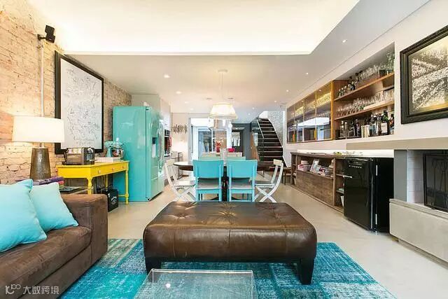 棕色的沙发,沙发背景墙选用了仿古砖,湖蓝色的地毯和抱枕,色彩搭配的非常舒服。