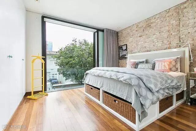 卧室明亮宽敞,卧室依然选用仿古砖作为床头墙面的背景墙,木质的地板,床下方还合理的设计了储物柜,整个卧室实用又美观,采光性也非常好。
