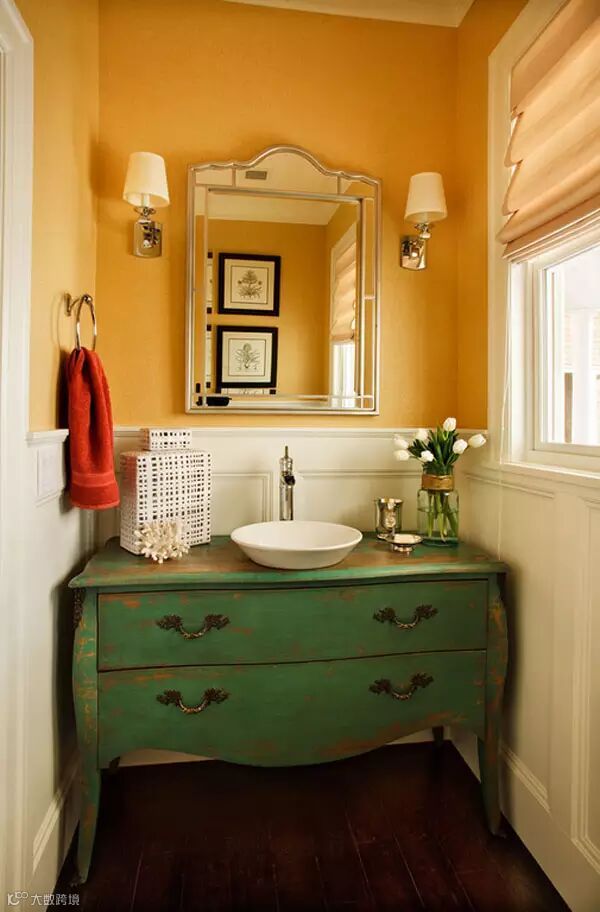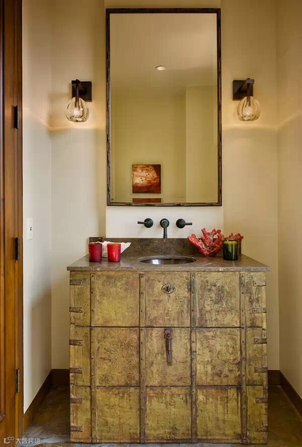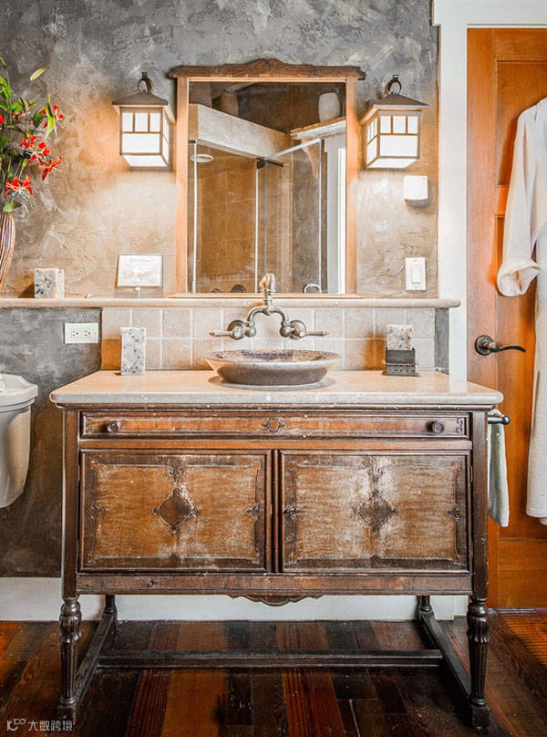 旧收纳柜变身梳洗台。斑驳的表面,别有一番风味!