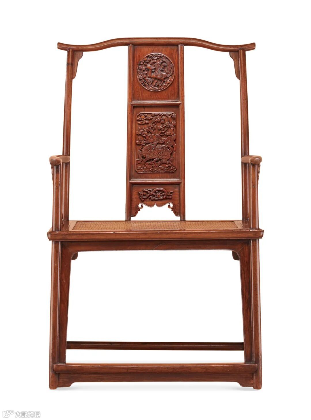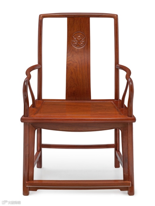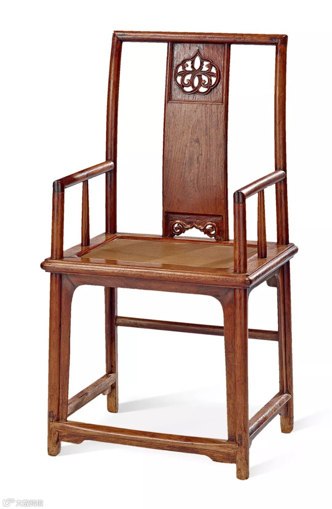 此官帽椅造型甚佳,且是罕见的样式,体现了明式家具洗练挺拔的风骨,靠背板的装饰又属秾华风格,繁而不乱,优美如雕塑般的联帮棍与之呼应,文雅之中又增贵气。