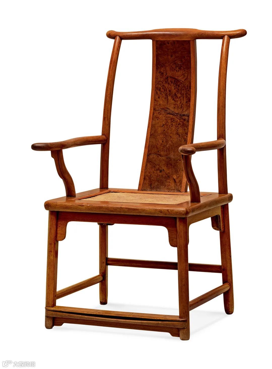 此椅主体框架为黄花梨,靠背后部装心板和座面活屉均为柞榛木所制,靠背正面则是一片完整的c形楠木瘿,搭脑弯弧有力,形如官帽,中部削出枕形。