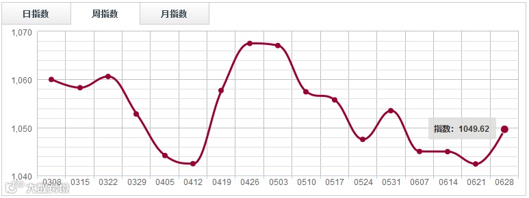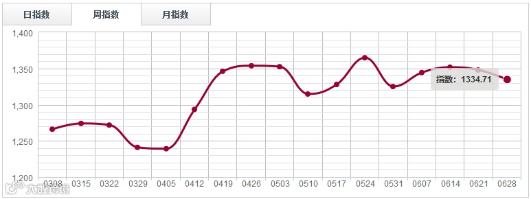 中国木材价格指数(CTI)综合指数本周报收1183.76点,环比收跌0.29%。其中广东鱼珠木材价格指数(YTI)报收1078.12点,微跌0.06%;上海福人木材价格指数(FTI)报收1258.99点,跌0.67%;大西南木材价格指数(DTI)报收1009.89点,下跌1.56%;山东临沂木材价格指数(LTI)收于824.26点,涨0.31%;江西南康木材价格指数(JTI)收于1604.74点,上涨0.03%。