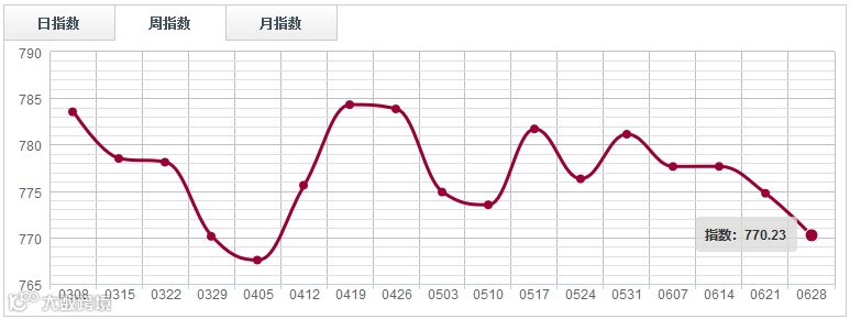锯材分类指数延续下滑态势,本周报收770.23点,环比下跌0.58%。其中鱼珠锯材指数、福人锯材指数、大西南锯材指数分别下跌0.12%、0.62%、1.41%;南康锯材指数微涨0.03%。