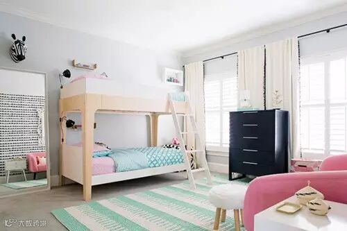点评:粉色系依然是儿童的最爱。从沙发到床垫,在白色为主色调的前提下,配上浅浅的绿色,穿插悦目的粉色,阳光可以透过落地窗洒进房间,显得明亮而充满朝气。