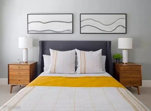 点评:在灰色的大背景墙下,壁画的选择也是不容小觑的,简约淡雅,质感十足的桌子,内嵌式的台灯,都提高了整个卧室空间协调感。
