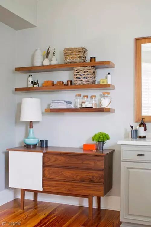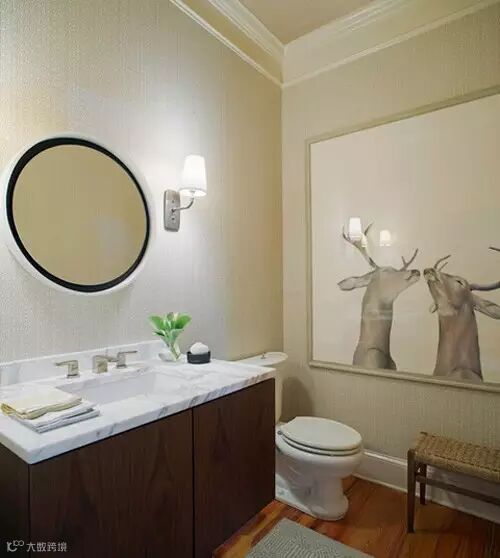 点评:不仔细的观察,还以为是卧室的摆设设计,圆形的镜子,双鹿头壁画,一张草藤凳,十分简洁的表现了空间的实用性和有效性。