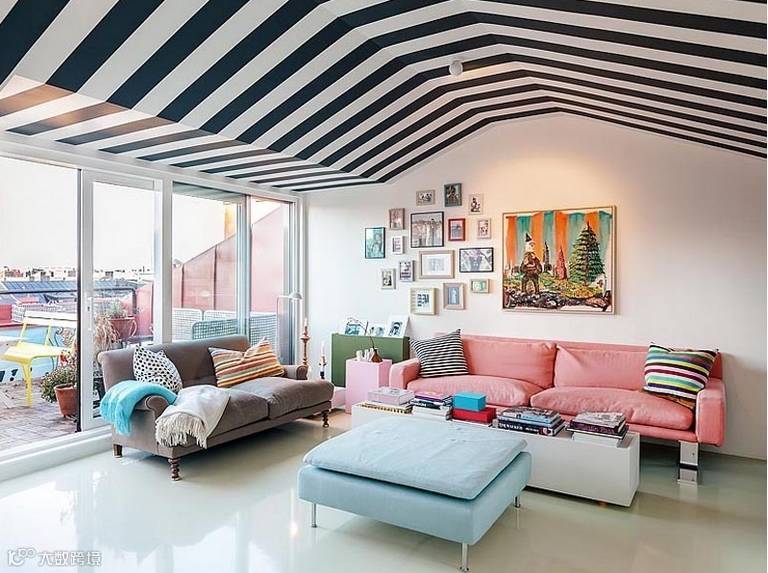 天花板用色:天花板用色有个很自然的规律--等于或浅于墙面颜色,否则会给人头重脚轻的感觉。当然如果你要搞特别,那就是具体情况具体分析了。