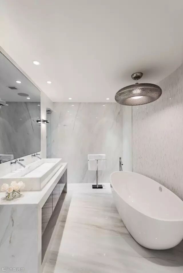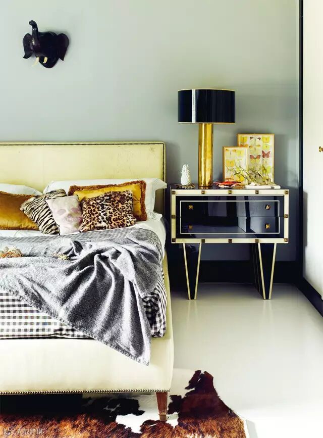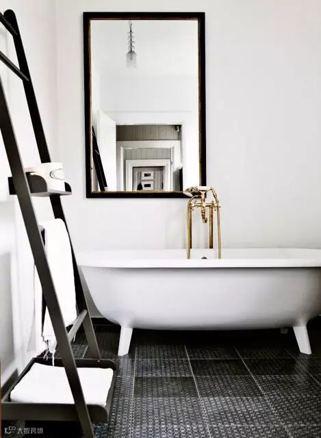 第一眼感觉哪里吸引了你,是黑白浴缸还是墙上的麋鹿装饰!但是你也不能忽略了那块菱形地毯及头顶的吊灯。