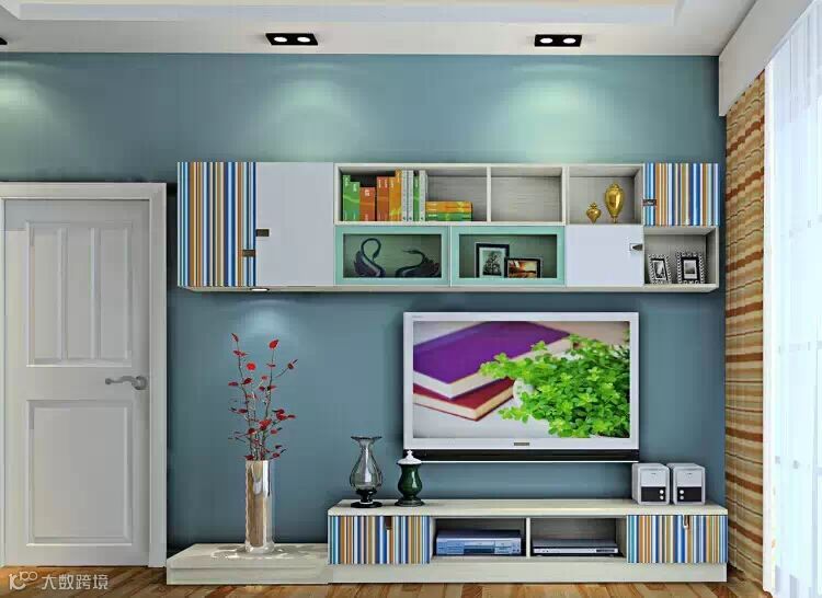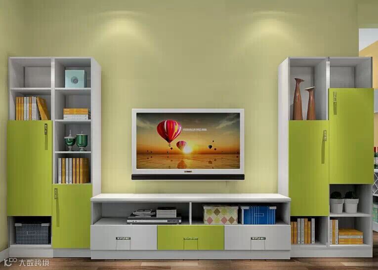 对称式的电视柜设计,暖绿色给透着温暖人心的亲切感。