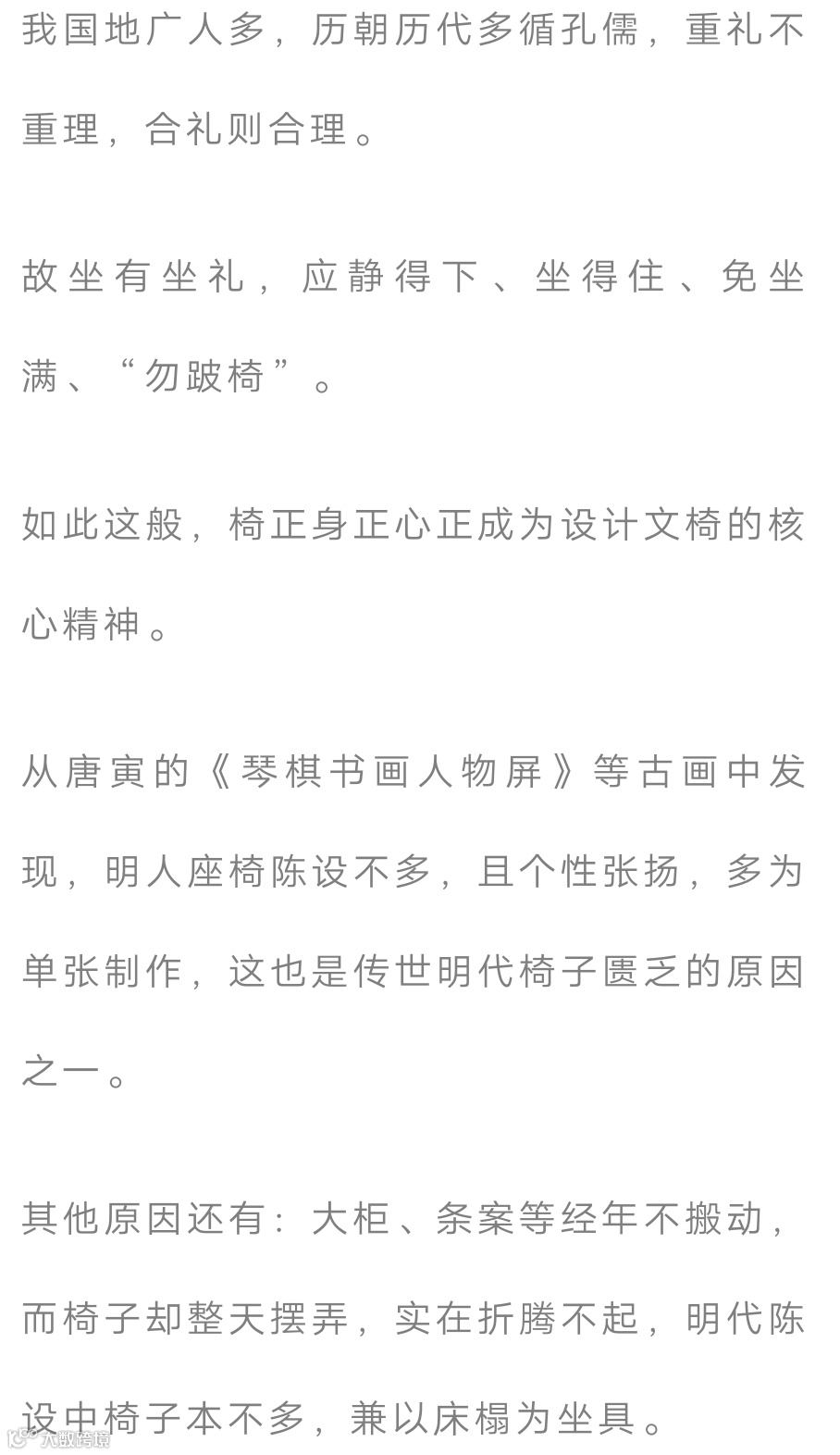 中国文化流产有序,秦汉及前席地而坐,唐始坐上床榻,宋后尚垂足坐高,入明,椅等家具渐臻成熟。