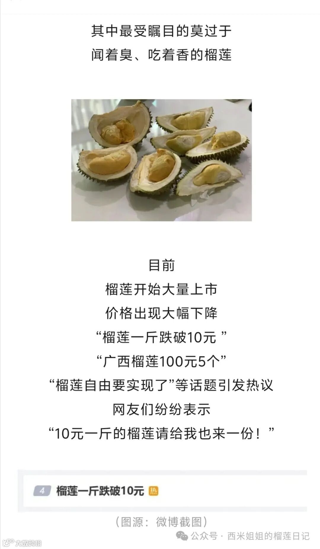 “榴莲1斤跌破10元”成为热门话题
