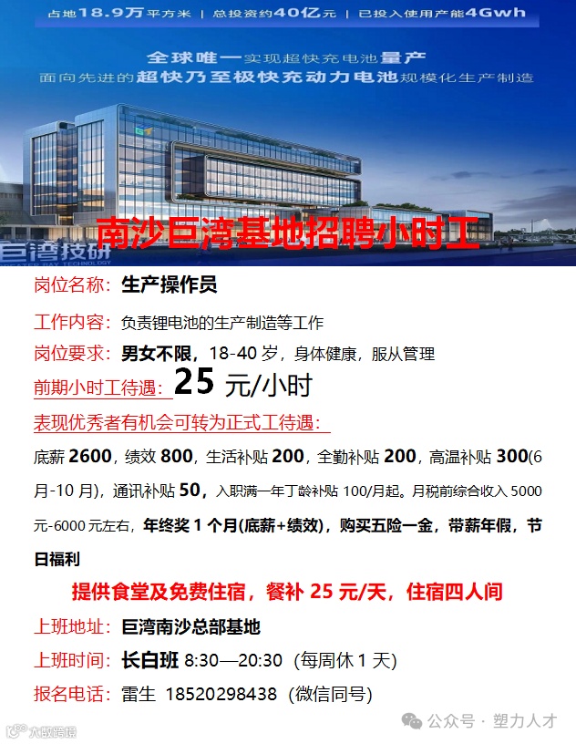 明天周五面试丨南沙巨湾总部基地丨长白班丨包吃包住丨男女不限丨生产操作员丨