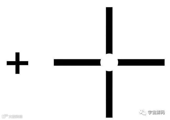 这是一个盲点幻觉,先闭上你的右眼找出你的盲点,同时用左眼看着小黑十字架,移动这幅图使它离你越来越近,直到百色圆点消失那么完整的十字架看起来像什么?很多人都会看到竖直的条在水平的条的前方。